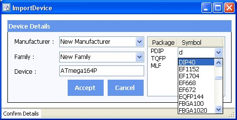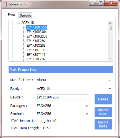 All this is done by pressing Enter in the correct Combo box once you have typed in the new selection. New parts can also be imported using BSDL files.