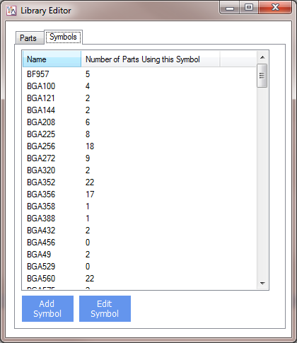 Clicking on the Symbols tab allows you to edit and add new symbols, using the Symbol Editor. You can also see have many parts in the library are using each symbol.