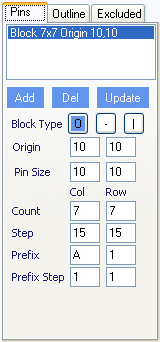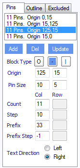 For each block the origin and pin size is as per Example 1 above. Try selecting the first block and then changing the pins size from 10x5 to 20x5 and then click update. For this first group you can see there are 11 pins. Again the step determines the distance between the pins. The prefix is the first number and this number is counting up on the first block. If we click on the third block, we will see that the Prefix is 33 and it counts down.