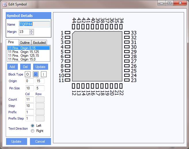 This is the most complex part of the symbol design - which it is why it is recommended to use the symbol that is most similar to the part you are creating. After changing any setting, click on Update to see the result of the change to the symbol.