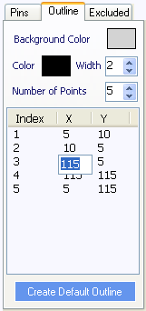 1. Change the background colour of the device 2. Change the outline colour and width 3. The Number of Points is is the number of items in the list. You can edit each of the points in the list 4. The Create Default Outline button creates an outline based on the position of the pins
