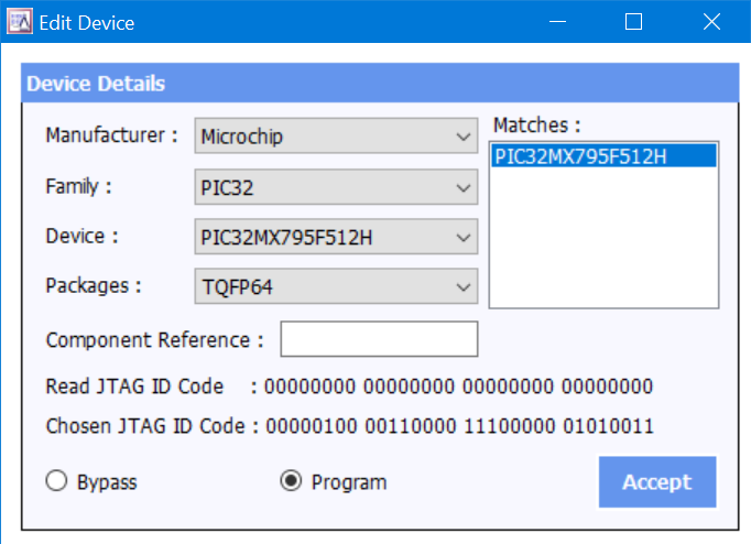 All of the other devices will appear in bypass mode. The PIC will appear in Programming Mode. If you have more than one PIC in the chain then you can click on the PIC you intend to program and select Program and then click Accept