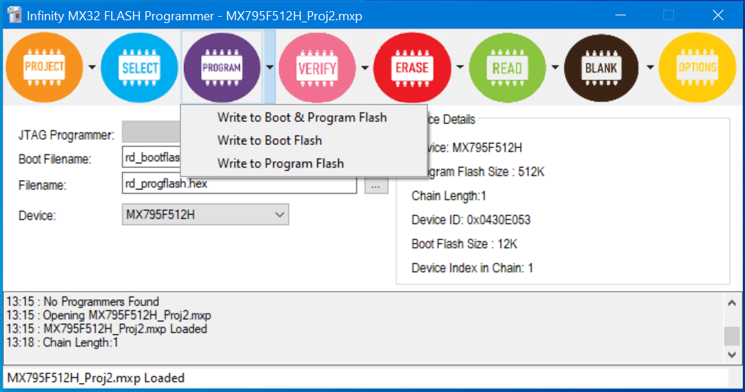 After selecting one of the drop down options, the main button will then become that option. The programming cycle will also verify the data programmed but it will NOT erase the device before programming. This is because the boot sector should not be erased if you are just programming the program sector. Click erase before programming the device if this is required.