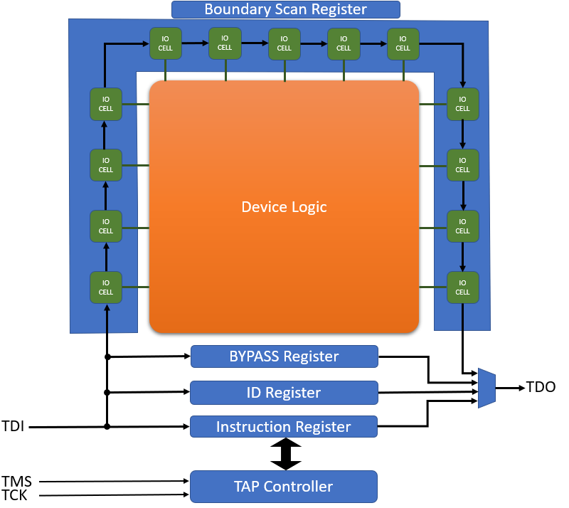 Boundary scan works by connecting all of the devices pins in a serial chain known as the Boundary Scan Register (BSR). All of the pins registers called cells as only available the the scan mode is activated. This allows the pins direction and value to be set regardless of the internal core logic and also allows the pin to be read. Cells can be of different types as these are later.