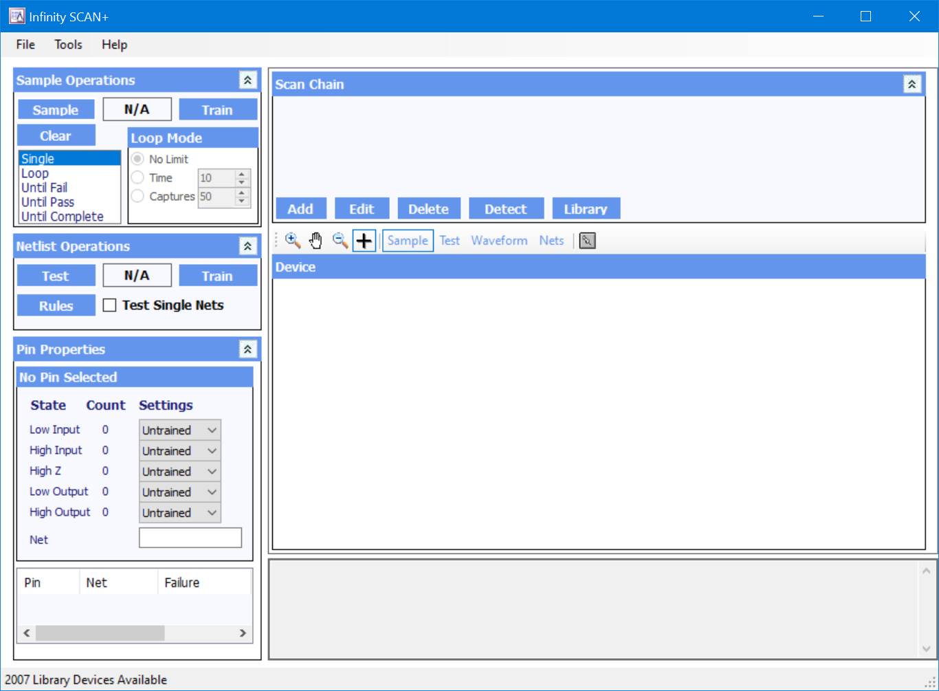 Infinity SCAN is a graphical tool to perform boundary SCAN testing on PCBs. It differs from other similar tools in that there is no requirement to import a netlist or ‘understand’ the target platform. SCAN can learn about the board through training.
