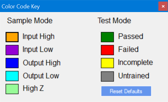 SCAN uses a color coded system to display the state of each pin. The default colors are shown below. The colors can be changed by clicking on the color.