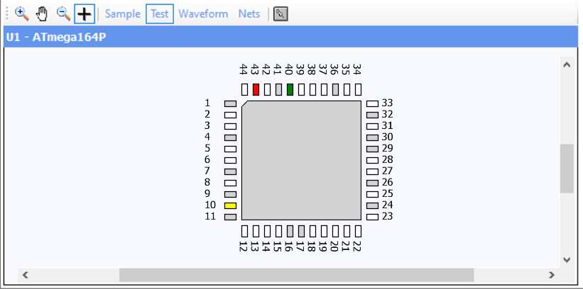 The Graphical Pin Display in the Device Window provides a quick and easy method for viewing information about all pins of a selected device in the JTAG scan chain.