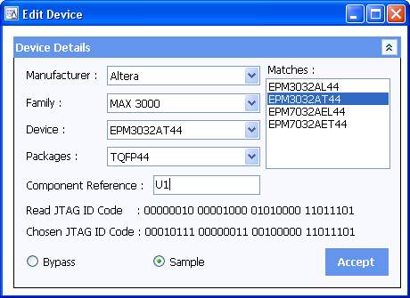 Then select Sample for the device to be included within the Scan Chain, or Bypass to remove the selected part from the Scan Chain. A device that is bypassed will not return boundary scan results speeding up data acquisition for remaining items in the chain. This can be useful if only one or two devices in the chain are of interest and will allow results from other devices to be ignored. As with the Component reference, this can be changed at any time by double-clicking on the device, or selecting and clicking on EDIT.