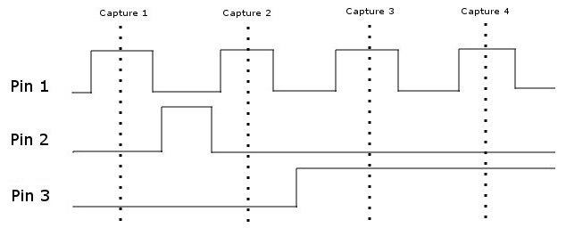 This shows four individual captures occurring one after the other for three pins. The time between captures depends on a number of factors including the number of devices on the boundary scan chain, the number of devices in bypass, the complexity of the devices and the speed of the computer being used. With the capture timing shown above, it will appear to the software that Pin 1 is always high and that Pin 2 is always low. In practice this is a highly exaggerated situation and in the majority of cases all pin states will normally be seen within a few seconds. However, it does highlight how important it is to allow enough time/captures to ensure reliable data is extracted from the target board.